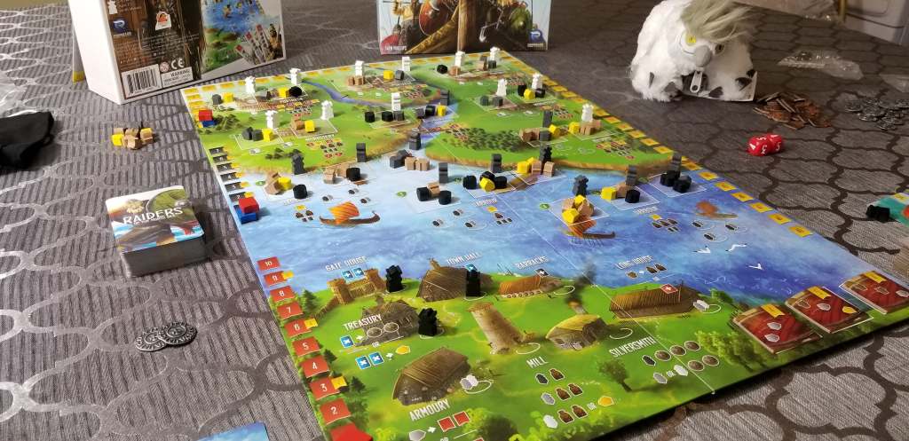 Today Kage and I played Raiders of the North Sea and it was an intense battle of Vikings. One thing that is absolutely amazing about this game is the differentiation between game plays. It’s a midweight worker placement euro game, and it does require some strategy, but that strategy is entirely dependent on the cards you find yourself with.