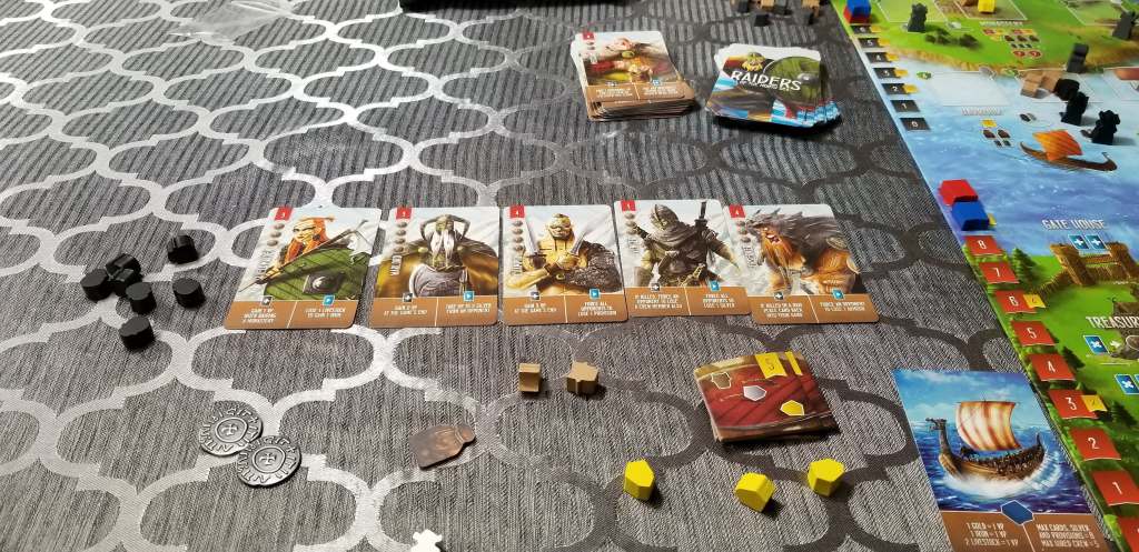 The components to this game are mostly standard meeple components with nice weighted fancy silver coins (They depict silver in the game, they are in fact stainless steel of some kind, but they look great). They’re gorgeous. The artwork for the raiders is really pretty and enjoyable to look at, and everything is legible.