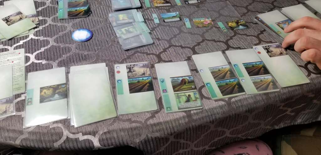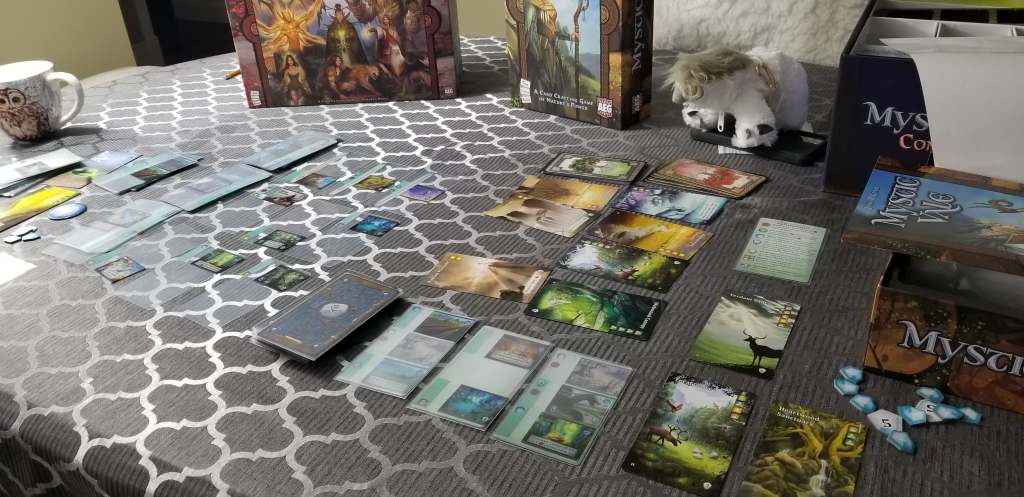 This most excellent Saturday brings us to Mystic Vale, where we face off as druids attempting to remove corruption from the land is this unique deck builder. Mystic Vale instantly stands out because of it’s nearly unique approach to deck building; instead of adding cards to the deck, you start with a complete deck which is modified by sliding clear plastic upgrades into the card sleeves, thus changing each card with each enhancement.