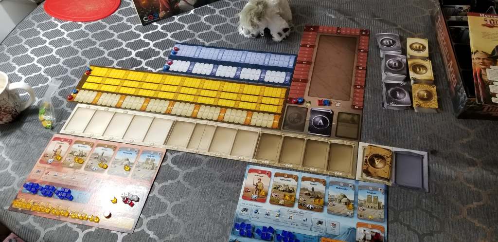 The game is much deeper than I can explain here without quadrupling the length of this blog post and unfortunately the rule book is not nearly as well written as the graphics are designed. It will certainly take players a few plays to really get a handle on the game as a whole, which may be a turn off to people not willing to invest a “learning play” into a 3 hour game. However for me, this is by far the best game to capture the feel of a civilization building game by far, and it manages to do it without a map.