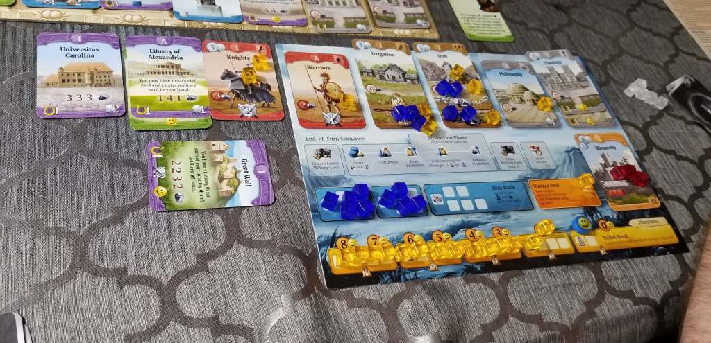 At it’s heart I suppose I could call the game a combination between action selection and engine building, but that is almost doing it a disservice, there is a whole lot more to it than that. Players get a number of civil and military actions per turn, with which they build their civilization. A player can build buildings, train troops, take cards, select bonus actions for the next turn, develop technologies and many other options depending on what cards they have taken from the general supply and what technologies they have developed.