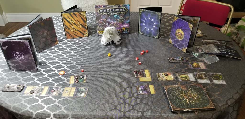 This afternoon marked our switch from euros into full on Amerithrash with Mage Wars Academy. I was introduced to this game via it’s big brother Mage Wars Arena, which despite being in my top 10 games of all time, doesn’t hit the tabletop very often anymore due it it’s excessive playtime. Academy hits a lot of the same notes while playing in a fraction of the time, and also acts as a decent introduction to the game for newer players, as the mechanics remain largely the same, with the exception of there no longer being a map to move across.