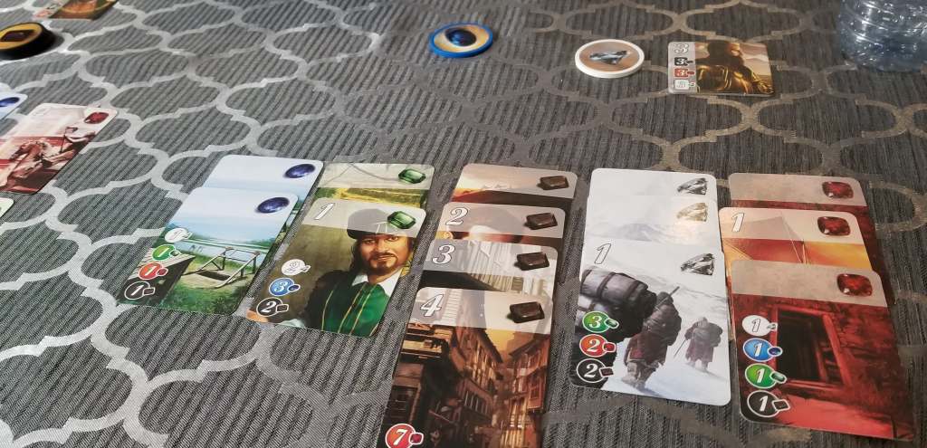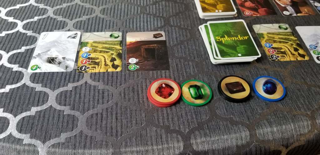 In Splendor you are searching to have the most beautiful jewels. The goal is simple: to get 15 points before anyone else. The game starts out with a bank of gems, which are a relatively heavy plastic chips with pretty artwork. The colours used are red, black, green, blue, and white, with gold being a “wild”/”bonus”. You pull nobles out (which are on cardboard, and pretty nice looking) depending on how many players there are, three for a two player game. The nobles will have certain cards listed and a number, for example, Henry the Eighth is four black gem cards and four red gem cards. At the start of your turn you can choose one of three actions: take gems (you can take two of one colour depending on how many are in the pile, or one of three colours), buy a card (which has a gem colour cost listed on it), or take a card from the table into your hand which gives you a gold wild gem.