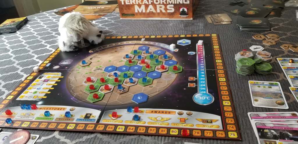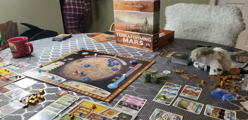 This evening Amanda and I brought Hector along for a journey into one of my personal favorite games and perennial favorite of the engine building genre; Terraforming Mars. I was initially very unimpressed with Terraforming Mars, when I first played I found the components to be bland and the theme dry, but subsequent playthroughs with a group more inclined to the genre showed that the game is not only great fun, but one of my all time favorites. For today’s game, we played with only the prelude expansion, which I generally refuse to play without.