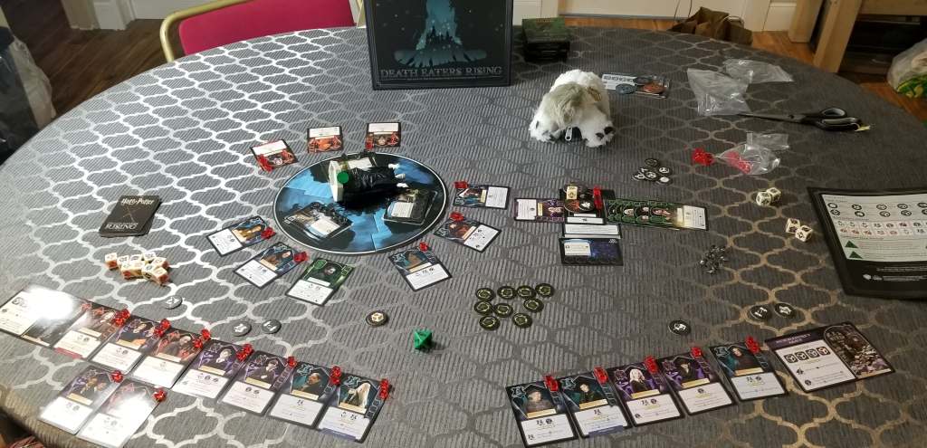 I don’t see the two player game changing much from say, a 4 player game. I suspect players will specialize a little more, with some focusing on corruption, some on healing and some on damaging death eaters and Voldemort. In our game Amanda and I both ended up with a mixed bag of wizards doing a little of everything.