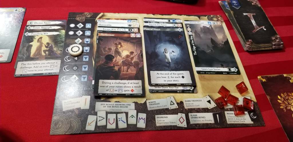 Most cards are gained by casting runes. All characters have access to the three basic runes, as well as any applicable bonuses they have for each challenge, and players may also cast dark runes for extra chances at success, but with the risk of become more corrupt, eventually losing the ability to use dark runes and taking a point loss at the end of the game. There are also hero and anti-hero cards which can be used to manipulate the game in various ways throughout. Each player is allowed to gather 3 cards for each “act” of their characters story and when one player has completed all 3 acts, the game ends at the end of the round. Final scores are calculated and whomever has the most points is the winner at which point players can tell the story of their character based on their cards.