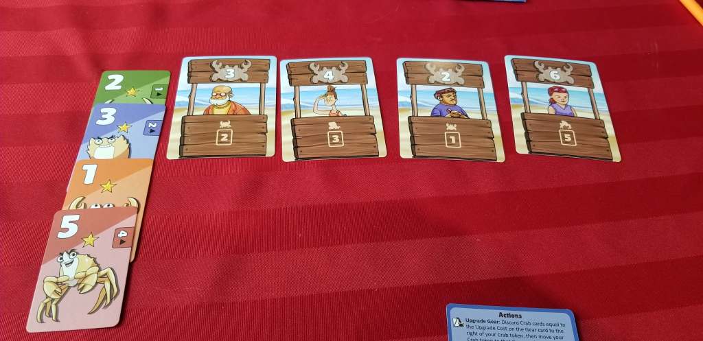 The game is about the collection and sale of crabs. Players can upgrade their gear, draw cards, trade crabs with the crab pool, capture crabs (either stressed or unstressed), de-stress crabs and sell crabs, with only calm crabs being able to be sold. The goal is to get the most points by filling crab orders, selling premium crabs and upgrading gear. It’s a pretty simple game, honestly there is not a whole lot to differentiate it from a dozen other filler card games.