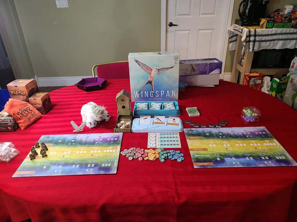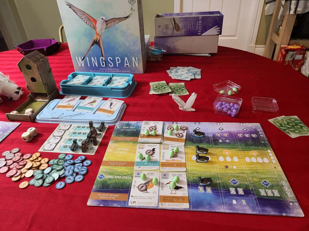 Happy boxing day everyone. Today Hector, Amanda and I sat down to play a game of Wingspan, with the European expansion. Wingspan is one of those games which I had played at a convention when it was released and then was unable to find for months because initial demand (and currently, for the expansions) vastly exceeded supply. It’s also one of our most frequently played games over the past year.