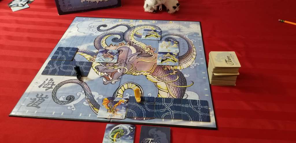 Today Kage, Hector and I ventured into the world of sea dragons in Tsuro of the Seas in game 2 of 3 for today. Tsuro of the Seas is a slightly more advanced and heavier game than the original Tsuro, though both could be considered fairly light and around the same general complexity as something like Monopoly, though this has more depth and theme. In Tsuro you have a ship that you are charted a course across the board for, but you have to be wary of sea dragons/monsters popping up and attacking you, and eating tiles you’ve placed out.