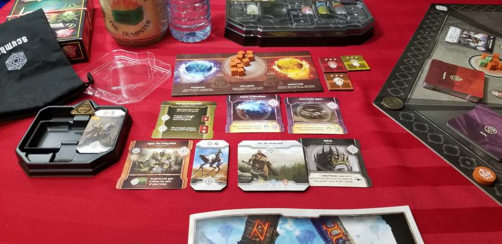 I have a lot of good things to say about this game, but I will start with something I have a serious complaint about, and that is the components. I’m sure some of you will look at the pictures and wonder if I had a little to much to drink for New Years day but allow me to explain. Vindication (at least the kickstarter version) has gorgeous production all around, but falls into the trap of overproduction in several areas. The worst of which is the cards, for some unfathomable reason they are “I” shaped. When I saw these I assumed they linked up with the player board or something but nope; just awkward to shuffle, unsleevable cards. The GameTrayz main insert is decent, if a bit fiddly, and the individual player trays are neat but completely unnecessary. Apart from this though, it’s a solid production all around, with good graphic design, excellent art and solid, chunky components.