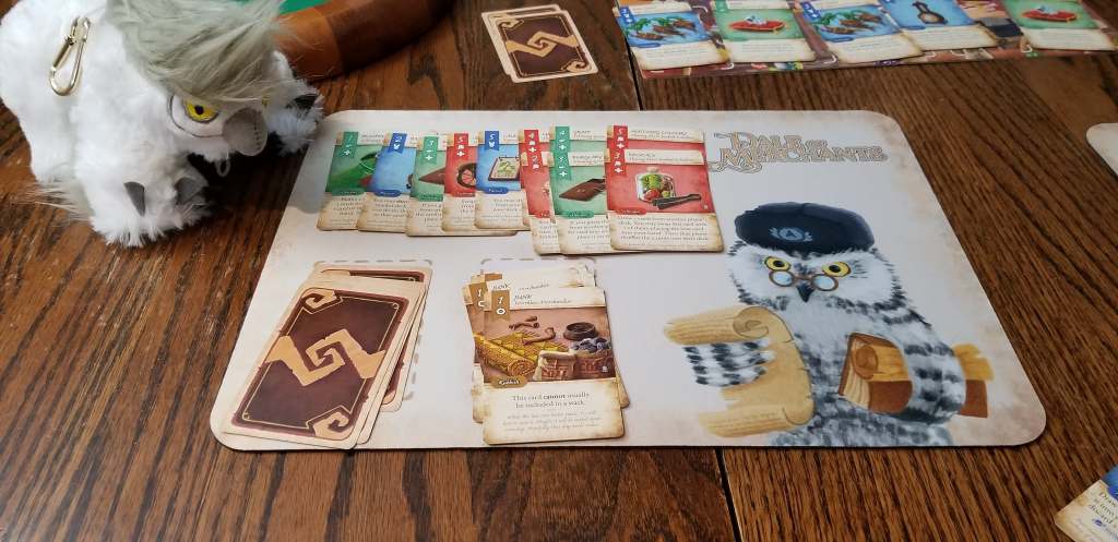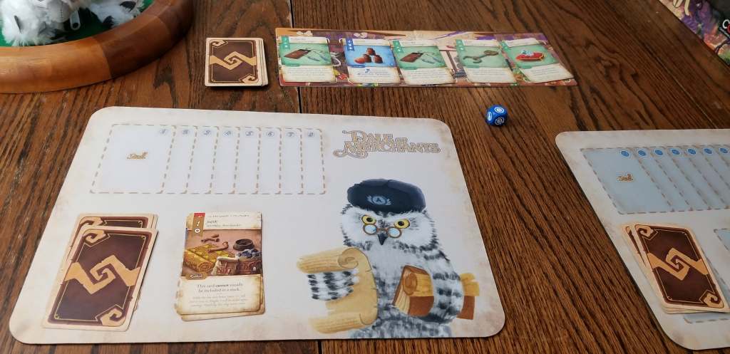 For those who have not played a Dale of Merchants game, it’s a quick deck builder in which players build a deck based on several different trader animals, each with a theme for their cards and attempt to build a tableau of 8 stalls. The stalls are built in order requiring cards that have a cost equal to their number, and cards of the same animal may be stacked to produce higher values. All cards also have a special ability of some sort that falls in line with their animal theme. First player to reach 8 wins the game.