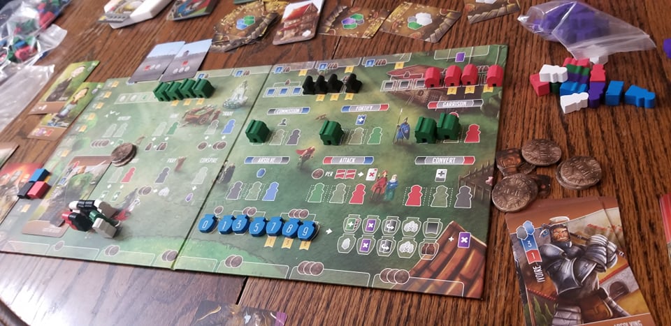 Where the game draws similarities to Scythe is that nearly every action apart from straight resource gathering raises one of your primary statistics and grants a bonus, which gets better each time the action is performed, and the bonus is revealed by removing the meeple on top of it. Choosing your paladin wisely each turn makes actions easier (or possible if your stats are otherwise too low), and assists in gathering resources. There are also multiple versions of each action, for example you can recruit a villager for a permanent bonus, or send them on a quest for a 1 time reward. Ditto for invaders who can be converted for an end game scoring bonus or defeated for an instant reward. Monks and strongholds can be placed out in various areas of the map to gain resources and bonuses, but each requires a different stat to be able to claim a space. You can upgrade your fortifications on your board for bonuses and well as absolving sins to remove corruption. Every single action I just described also increases one of your primary stats by at least 1, and has a minimum requirement in a different stat and resource cost, and the majority of them provide an escalating bonus as they are performed.
