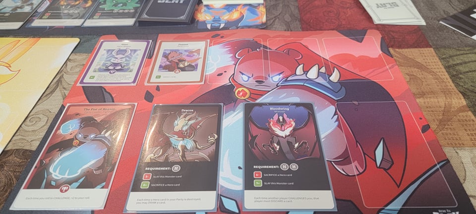 Today Kage, Hector, Eddie and I broke out our kickstarter edition of Here to Slay, by the same people who made Unstable Unicorns. Firstly, obviously the art is great. The placemats are super cute, and I love that each creature had its own class (squirrels were bards, unicorns were guardians and so on). The components were well designed and put together.