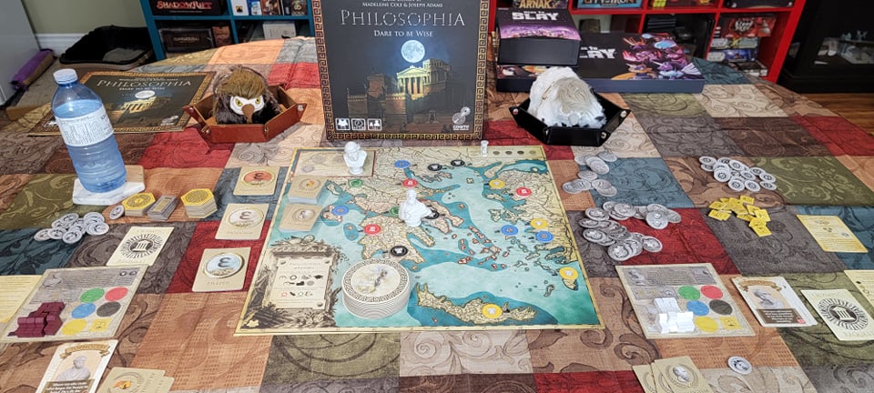 Hello and good evening everyone. Tonight I was joined by Hector, Eddie and Amanda for a round of Philosophia: Dare to be Wise. Dare to be wise is actually the first in a series of games, the second being; Philosophia: Floating World. I had backed the second one and in the pledge manager, the first was available for a very reasonable price (I believe 30 extra) and it looked decent so I decided to take a chance and add it in. I’m glad I did as it was an interesting experience overall. How Interesting? Read on to find out.