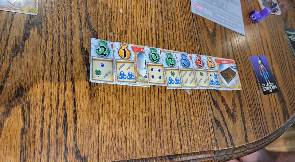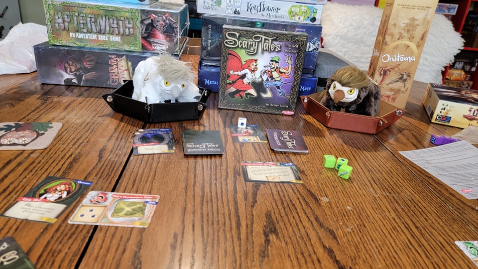 Today Kage, Hector, Eddie and I sat down and played a couple of games. The first of those games was Scary Tales. Don’t let the name fool you, for it isn’t a kids game, as it’s meant for 13+. The game itself has a simple enough premise- your character (in this starter game you have Red Riding Hood or Pinocchio to choose from) must be the first to have 7 points in relics at the start of your turn. The real trick is that some relics only have modifier points, meaning that you must already have a scoring card without a plus of that same relic colour in order to get the points. The relics are in a fortune deck and you end your turn after you’ve drawn one, though there are other cards that might shift things around in the game such as giving a player the fairy card, which gives you an extra fourth die.