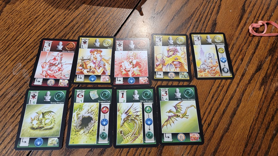 Although the gameplay is fairly simple, there is some nuance to how one drafts the cards because nearly all of them interact with each other in some way. Some cards combo with copies of themselves, some with specific other cards and some with certain types of cards, granting a scoring bonus. This will all be familiar to anyone who played 7 Wonders. What is unique to Fairy Tale is the ability to flip cards, making them unscorable. Flipping cards can be either an offensive move against other players with “hunting” cards, or a sacrifice for a greater score, for example the high point dragon’s den requires it’s player to flip a dragon card to place it down. Since other cards also have the ability to flip them back up, it makes for some interesting play as different players vie for different combos.