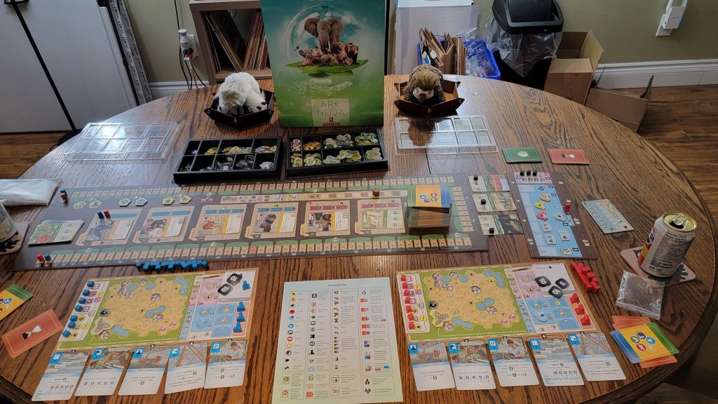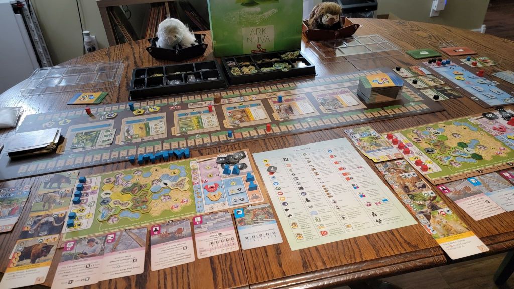 Good evening everyone! Earlier this evening Amanda and I were joined by our ever-faithful owlbears Hector and Eddie for a game of Ark Nova. Rave reviews of this game, often compared to Terraforming Mars, have been making the rounds online and it wasn’t easy to get a hold of until now. Can the game some have dubbed “Terraforming Zoo” hold up to one of the greatest engine building games of all time? Read on to find out.