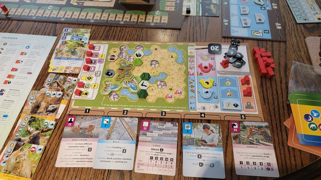 There is a lot of things to do in the game, so my gameplay summary will be far from exhaustive. A players turn consists of choosing and activating one of their action cards, which perform the various game tasks, and have a more useful effect the further to the right they currently sit in the tableau. Most of these either increase your score or build your engine and include things such as; building new buildings in the tableau, drawing cards, playing animals into the zoo, sponsor or conservation cards, doing association actions and so on. There are two “scores” the first being appeal, which governs your income and is mainly increased by adding animals, and conservation, which provides miscellaneous bonuses and is slowly but steadily increased through various game actions. The score tracks start on opposite ends of the board and when the two meet for any player, this triggers the end game, with final score being determined by the distance between the two scores.